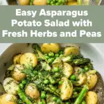 A fresh and vibrant asparagus potato salad featuring tender new potatoes, crisp asparagus, and sweet peas, all tossed in a zesty lemon and grainy mustard dressing with fragrant fresh herbs. Perfect as a light side dish served warm or chilled.