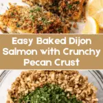 This Baked Crusted Dijon Salmon features tender salmon filets topped with a flavorful crust of buttery Dijon mustard, honey, breadcrumbs, and pecans. Baked to perfection, it offers a crispy textured topping and a tender, flaky interior, garnished with fresh lemon and parsley for a bright, fresh finish. Perfect for an easy yet impressive dinner.