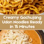 This Creamy Gochujang Udon Noodles recipe features tender udon noodles coated in a rich, spicy, and savory gochujang cream sauce. Enhanced with garlic, shallots, and a hint of umami from soy sauce and parmesan cheese, this quick and satisfying dish delivers a perfect balance of heat and creaminess, ideal for a comforting meal ready in just 15 minutes.