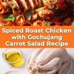 - Assemble and Serve: Arrange the dressed carrot salad on a large serving platter. Sprinkle toasted coriander seeds and garnish with remaining mint, basil leaves, and optionally, sliced bird’s eye chili for extra heat. Carve the rested chicken into 8 pieces and serve alongside the salad with extra gochujang dressing to drizzle or dip.