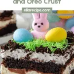 - Add the topping and decorations: Spread the remaining Cool Whip over the set pudding layer. Sprinkle the reserved Oreo crumbs evenly on top. Chill the entire dessert in the fridge for about 2 hours to fully set. Just before serving, decorate by placing one marshmallow Peep on each serving piece and sprinkling with mini Cadbury eggs or M&M eggs, as well as edible green grass for a festive touch.