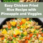A quick and easy Chicken Fried Rice recipe featuring tender chicken breast, juicy pineapple chunks, scrambled eggs, and a colorful mix of peas and carrots, all stir-fried with fragrant green onions and soy sauce for a deliciously satisfying meal.