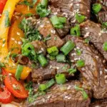 This Easy Korean Noodles with Beef recipe perfectly balances spicy, savory, and sweet flavors by combining gochujang, honey, and fish sauce. Tender slices of sirloin or ribeye steak are stir-fried with fresh vegetables and tossed with egg noodles for a quick, flavorful meal that’s ready in just 30 minutes. Garnished with sesame seeds and green onions, this dish brings authentic Korean flavors to your dinner table with simple ingredients and straightforward steps.