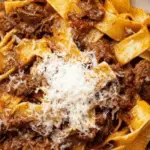 - Cook Pasta and Serve: While the sauce is simmering, cook pappardelle pasta according to package instructions until just al dente. Toss pasta with the ragu sauce and garnish with additional grated Parmesan cheese. Serve hot and enjoy!