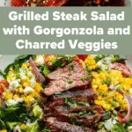 A vibrant and flavorful Gorgonzola Steak Salad featuring marinated grilled skirt steak, charred sweet corn, and zucchini, served on a bed of spring mix, arugula, and endive, topped with grape tomatoes, fresh herbs, and a tangy balsamic dressing infused with garlic and Dijon mustard.
