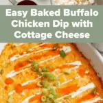 Spice up your snack time with this easy and healthy 4-ingredient Buffalo Chicken Dip! This baked appetizer is packed with protein and combines shredded white chicken breast with a creamy blend of cottage cheese, cheddar, and spicy buffalo wing sauce. Lower in fat and calories than traditional versions, it’s perfect for a guilt-free crowd-pleaser served with tortilla chips or veggie sticks.