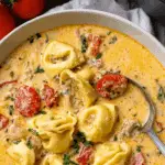 A hearty and creamy Sausage Tortellini Soup featuring savory ground pork sausage, fire-roasted diced tomatoes, and tender cheese tortellini simmered in a rich chicken broth and half-and-half base. Finished with sour cream and fresh basil, this comforting Italian-American soup is perfect for a cozy family meal.