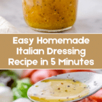 A quick and easy Homemade Italian Dressing recipe that is fresh, flavorful, and perfect for salads. Made with simple pantry staples like extra virgin olive oil, white vinegar, Dijon mustard, honey, garlic powder, Italian seasoning, and herbs, this dressing can be shaken together in minutes and stored in the fridge for convenience.