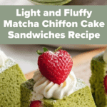 These Matcha Chiffon Cake Sandwiches feature a light and airy matcha-flavored chiffon cake paired with fluffy whipped cream and fresh strawberries, offering a delicate and refreshing dessert. The cake is baked in a tube pan for a soft and spongy texture, then sliced and filled with sweetened whipped cream and juicy strawberries to create elegant cake sandwiches perfect for teatime or special occasions.