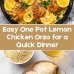 This One Pot Lemon Chicken Orzo recipe features tender, juicy bone-in chicken thighs cooked with zesty lemon and buttery orzo pasta. The dish is prepared in a single oven-safe skillet, first searing the chicken for a crispy skin and then baking it with lemon, broth, and toasted orzo for a flavorful, comforting meal that’s perfect for a family dinner.