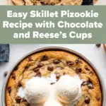 This delicious Pizookie recipe combines the rich, gooey texture of a cookie with the warm, comforting presentation of a skillet dessert. Perfectly baked to have a slightly gooey center and topped with a mix of chocolate chips and Reese’s cups, this dessert is best enjoyed warm with a scoop of vanilla ice cream and optional hot fudge topping for an indulgent treat.