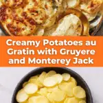 This classic Potatoes au Gratin Gruyere recipe is the ultimate comfort side dish, perfect for holidays or any special occasion. Creamy, cheesy layers of thinly sliced Yukon gold potatoes are baked in a rich Gruyere and Monterey Jack cheese sauce flavored with garlic and onion, creating an irresistible golden bubbly top. Serve this warm and let it be a family favorite at your dining table.