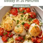 A quick and delicious scallop pasta recipe featuring tender seared scallops and vibrant cherry tomatoes tossed with linguine in a buttery garlic sauce, perfect for a flavorful weeknight dinner.