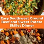 This Southwest Ground Beef Sweet Potato Skillet is a flavorful and hearty 30-minute dinner perfect for busy weeknights. Ground beef is cooked with sweet potatoes and seasoned with delicious southwest spices like chili powder, cumin, and smoked paprika. Topped with melted cheddar cheese and fresh cilantro, this dish combines savory, spicy, and fresh flavors in one comforting skillet meal.
