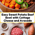 This Sweet Potato Beef Bowl with Cottage Cheese is a vibrant and nutritious meal featuring roasted sweet potatoes, taco-seasoned ground beef, and savory seasoned cottage cheese. Topped with creamy avocado, spicy jalapeños, hot honey, and red pepper flakes, this recipe offers a delicious balance of protein, fiber, and flavor, perfect for a quick and easy dinner or meal prep.