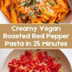 This Vegan Roasted Red Pepper Pasta is a creamy, flavorful, and nutritious plant-based meal ready in just 25 minutes. The dish features penne pasta tossed in a rich sauce made from sautéed onions, garlic, roasted red peppers, and a blend of cashews and vegetable broth, seasoned with Italian herbs and red pepper flakes for a subtle kick. Perfect for a quick weeknight dinner, it’s topped with fresh parsley and vegan parmesan for an extra burst of flavor.